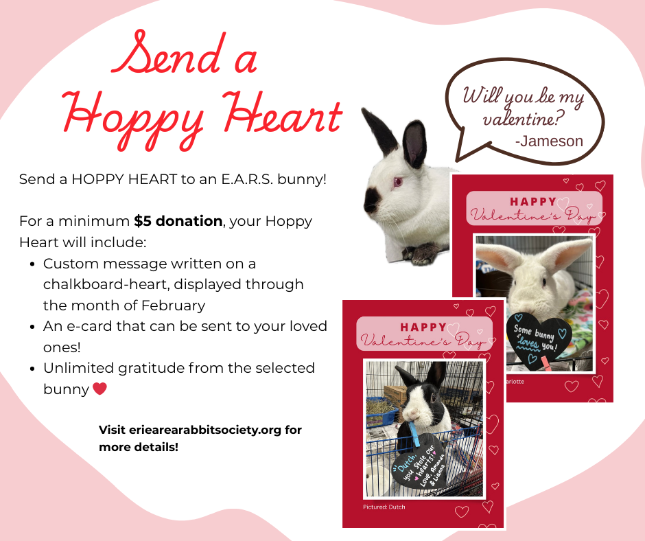 February is Adopt a Rescue Rabbit Month! For those who can’t adopt, we also have the option to sponsor a bunny by sending a Hoppy Heart! Your sponsorship donation will go towards the bunny’s food, hay, and fresh veggies for the month!